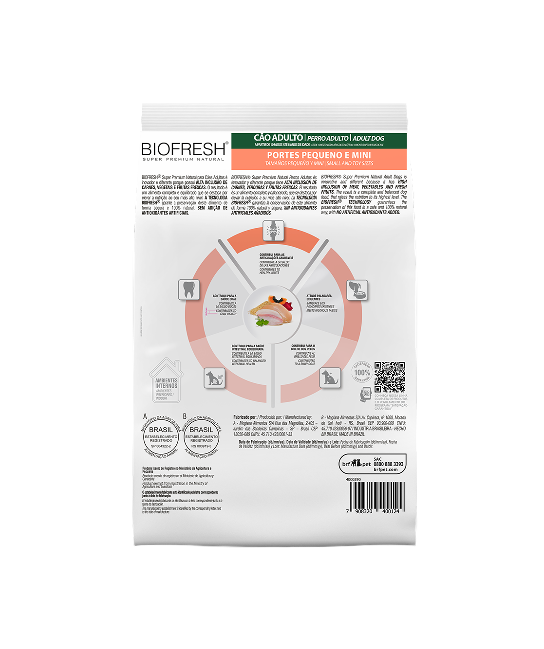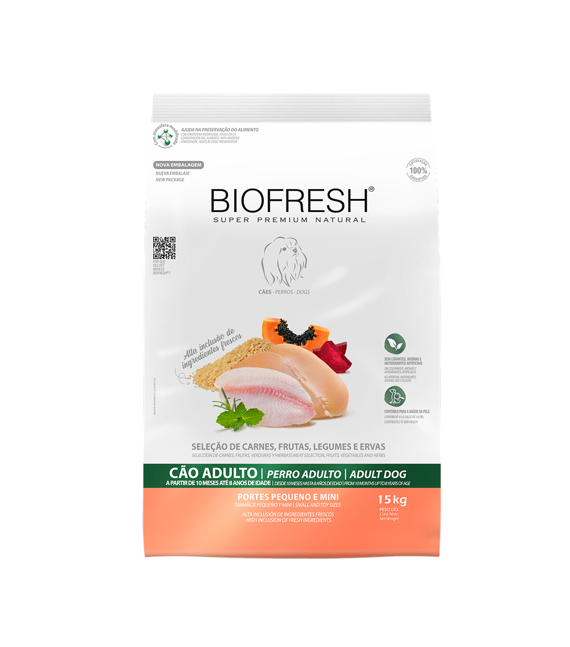 Biofresh Super Premium es innovador y diferente, porque tiene REALMENTE ALTA INCLUSIÓN DE INGREDIENTES REALMENTE FRESCOS, directamente de la naturaliza. El resultado es un alimento completo y equilibrado que se destaca por elevar la nutrición de los perros de razas pequeñas y mini a su más alto nivel. La TECNOLOGÍA Biofresh garantiza la conservación de este alimento de forma 100 % natural y segura, SIN CONSERVANTES ARTIFICIALES AÑADIDOS.